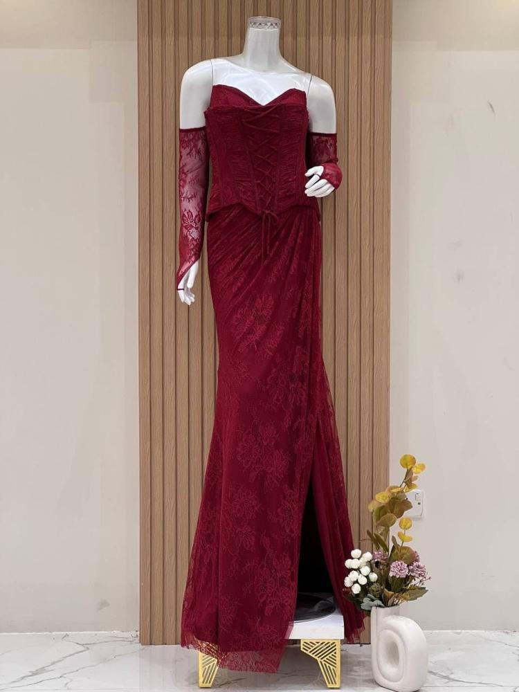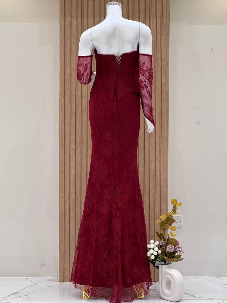 فستان سهرة ناعم من الدانتيل الفاخر، يجمع بين الأنوثة والنعومة. يتميز بصدرية كورسيه مكشوفة مع أربطة أمامية تضيف لمسة فنية، وأكمام دانتيل منفصلة تمنحك حرية وأناقة في كل حركة. فتحة جانبية تكمل الإطلالة لتجعلك محط الأنظار في كل مناسبة.