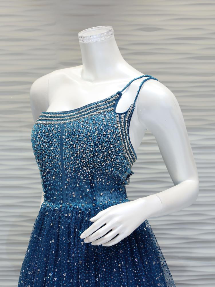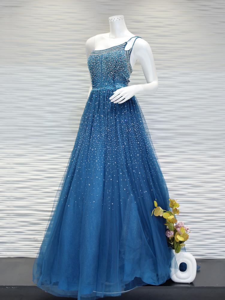 استمتعي بإطلالة تجمع بين الفخامة والتفرد مع فستان "كوكبة" الطويل المرصع بالكريستال والمصمم بقصة ون شولدر من التل. ينساب القماش بلون التركواز الساحر بانسيابية راقية، فيما يزين الكتف تصميم مميز يضفي لمسة درامية تسرق الأنظار.