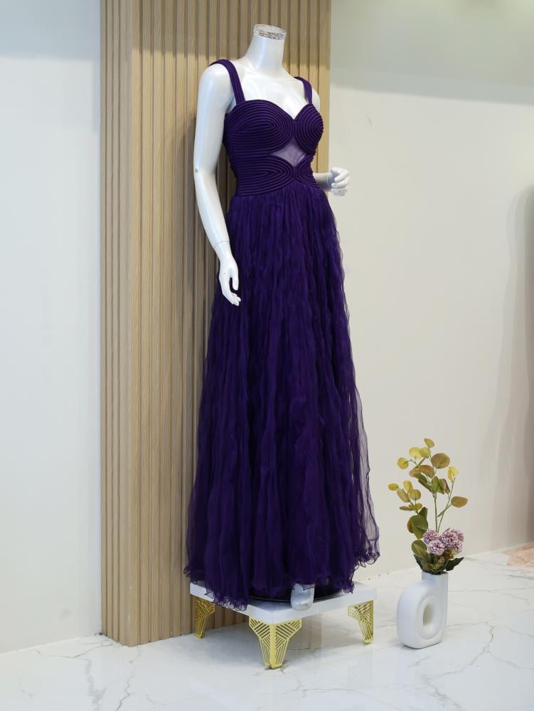 فستان "ليلك" يخطف الأنظار من كل زاوية. يتميز بصدرية بتصميم فني مبتكر يبرز جمال القوام، فيما تنسدل تنورته الواسعة من التل المتدرج لتمنحك إطلالة مفعمة بالأنوثة والتميز.