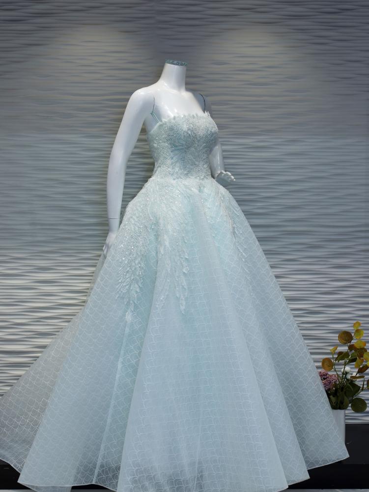 ساحر، ومليء بالجاذبية هذا هو فستان "ملكة" بتصميم منفوش وصدرية كورسيه محددة للقوام مرصعة بتطريزات براقة كالجواهر المنثورة، ينسدل من بعده قماش التل السلفر المزدان بنقشة هندسية متلألئة تمنحك حضورًا فخمًا يليق بالملكات.